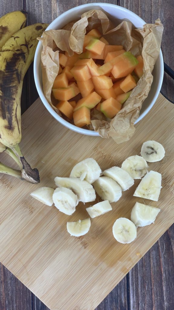 Beginne die Zubereitung der Nana-Eiscreme mit Melone, indem du eine Scheibe von der Cantaloupe-Melone abschneidest.