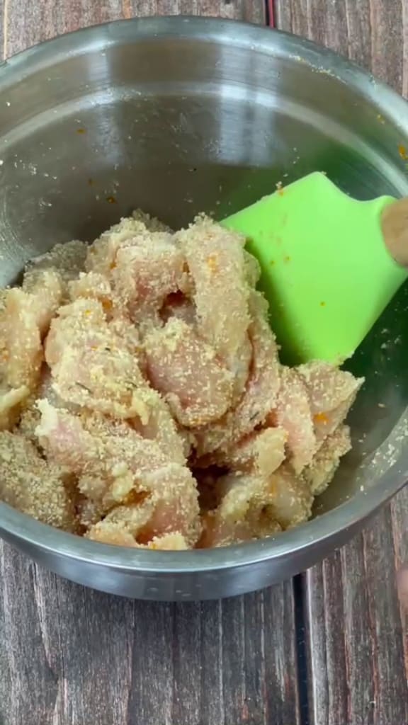 Vermenge alles gut mit einem Spatel oder einem Löffel, bis das Hähnchen vollständig mit Paniermehl bedeckt ist.