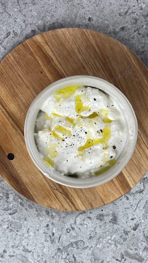 Gib die Stracciatella in eine kleine Schüssel und würze sie mit schwarzem Pfeffer und extra nativem Olivenöl.