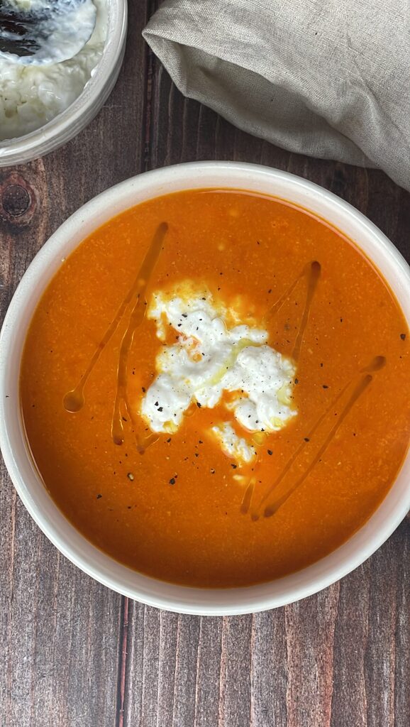 Diese Paprika-Suppe ist ideal für ein leichtes aber raffiniertes Abendessen, das als Hauptgericht oder in kleineren Portionen als Vorspeise serviert werden kann. Sie ist vegetarisch, nahrhaft und natürlich glutenfrei. Der geriebene Parmesan fügt Würze hinzu, während das extra natives Olivenöl und eine Prise schwarzer Pfeffer das Gericht mit Geschmack und Einfachheit abrunden.