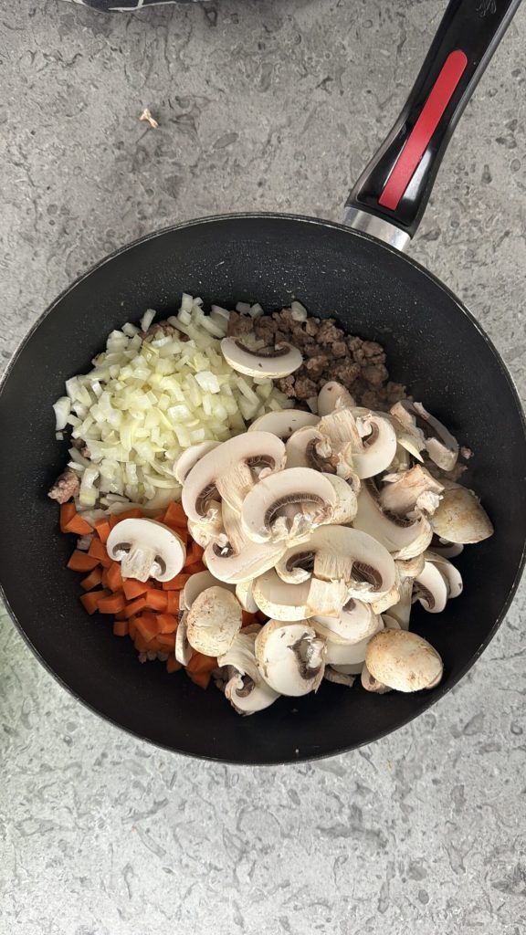 Das Ergebnis ist eine reichhaltige, aber ausgewogene Sauce, bei der jede Zutat ihren Charakter behält, ohne die anderen zu überdecken. Karotten und goldbraun angebratene Zwiebel bilden eine zarte Grundlage, während die Pilze Geschmackstiefe beitragen und die Erbsen eine leicht süße Note hinzufügen, die das Gericht abrundet.