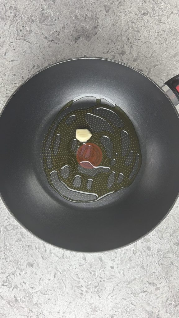 Gib eine Knoblauchzehe dazu und brate sie von allen Seiten goldbraun an.