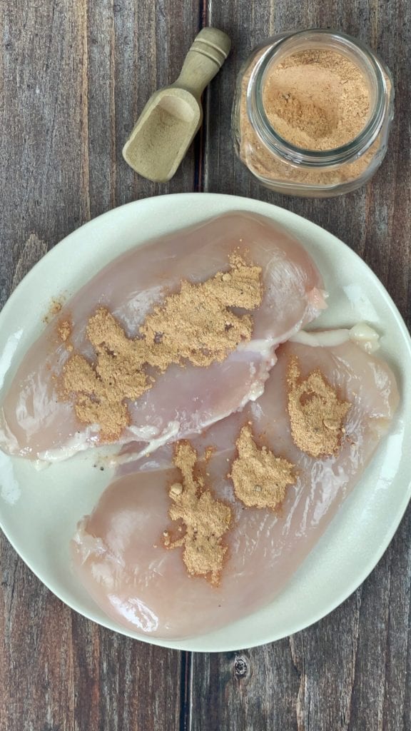 Würze das Huhn mit den Gewürzen, ich habe mein hausgemachtes Rub auf Basis von geräuchertem Paprika verwendet.Verteile die Gewürze gut mit den Händen oder der Rückseite eines Löffels.