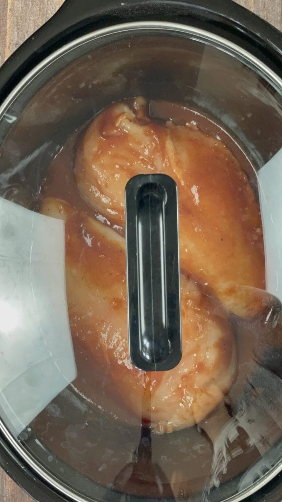 Gib auch die marinierten Hühnerbrüste hinein.Wende das Huhn ein paar Mal, damit es gut mit Barbecue-Sauce bedeckt ist.