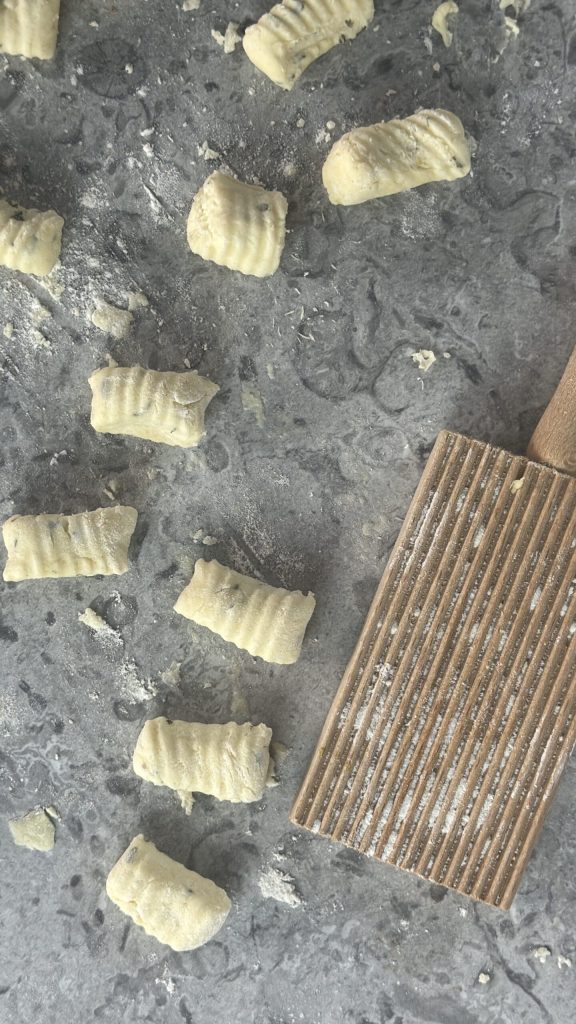 Jetzt bleibt nur noch, die Gnocchi mit dem Gnocchi-Brett oder den Zinken einer Gabel zu formen.