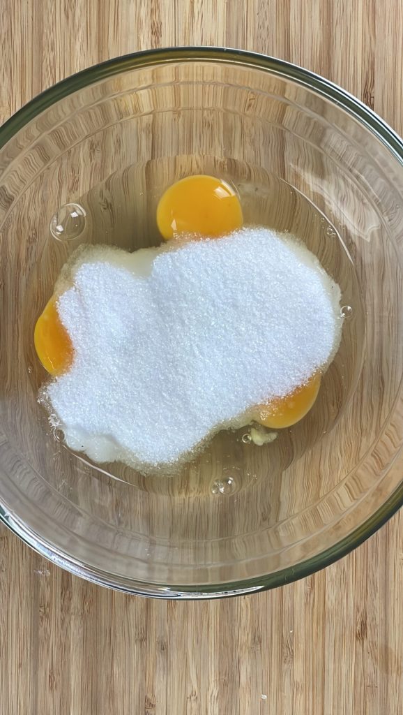 In einer anderen Schüssel die Eier aufschlagen und den Zucker wiegen: Mit dem Handmixer schlagen, bis sie das doppelte Volumen haben.