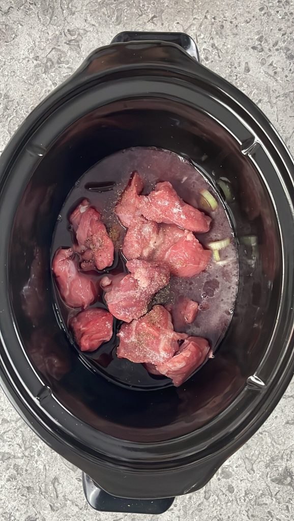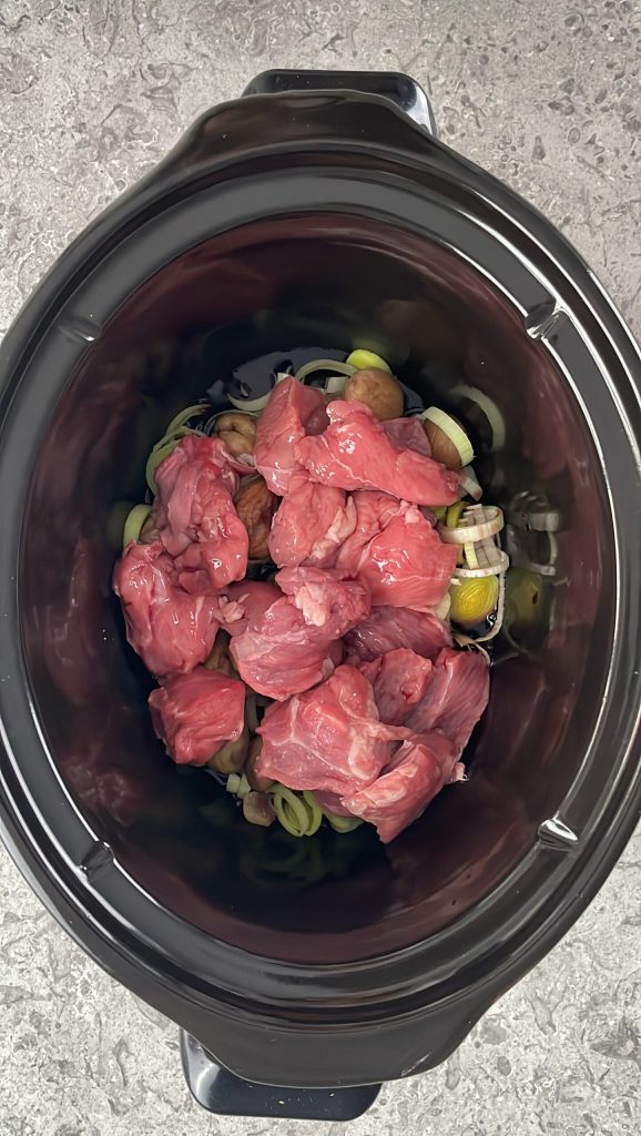 Sehen wir uns gleich an, wie man Schritt für Schritt das Rindergulasch mit Kastanien und Rotwein im Slow Cooker zubereitet.