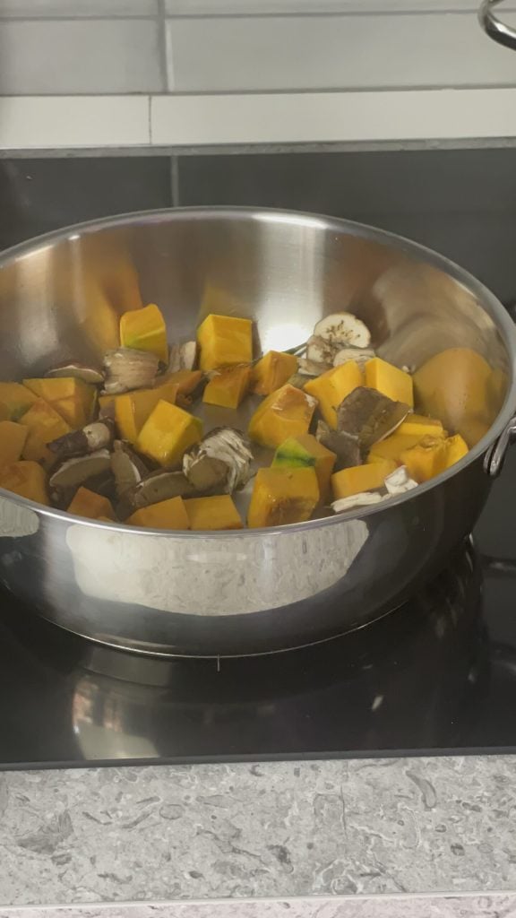 Gib auch den Kürbis und die Steinpilze in den Topf und brate sie für etwa 3 Minuten an.