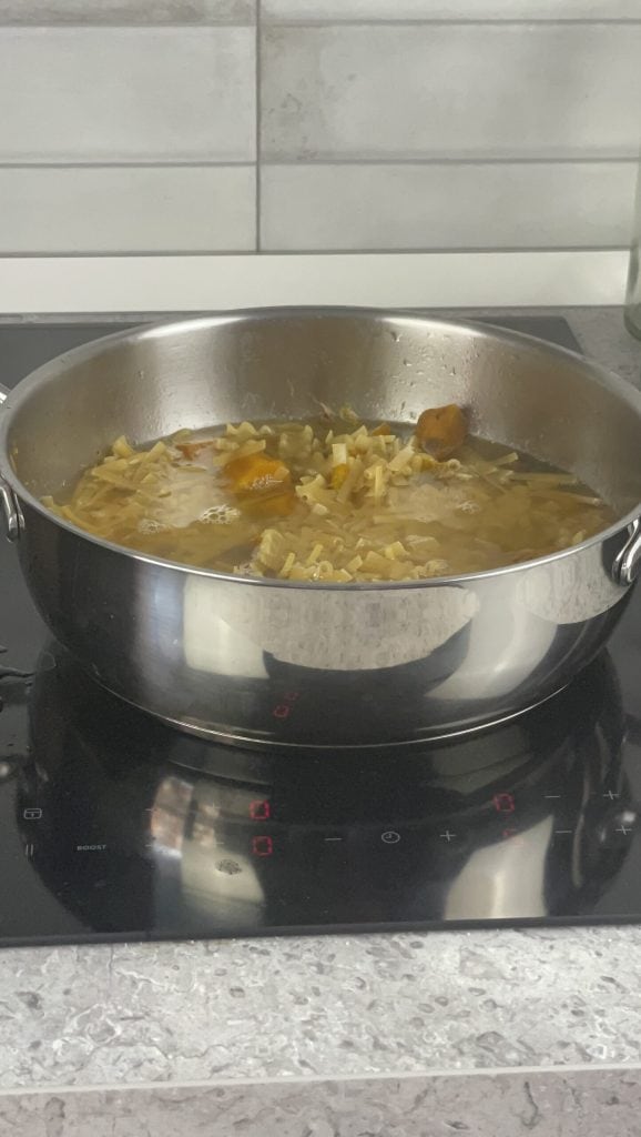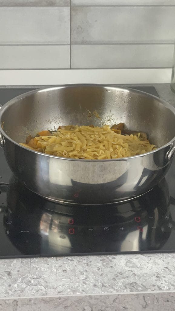 Gib die Pasta in den Topf mit Kürbis und Pilzen und vermische alles mit einer Kelle, um alle Zutaten zu verbinden.Bedecke alles mit Wasser/Brühe und setze das Kochen fort, indem du gelegentlich umrührst, für die Kochzeit der Pasta. Füge bei Bedarf Wasser/Brühe hinzu.