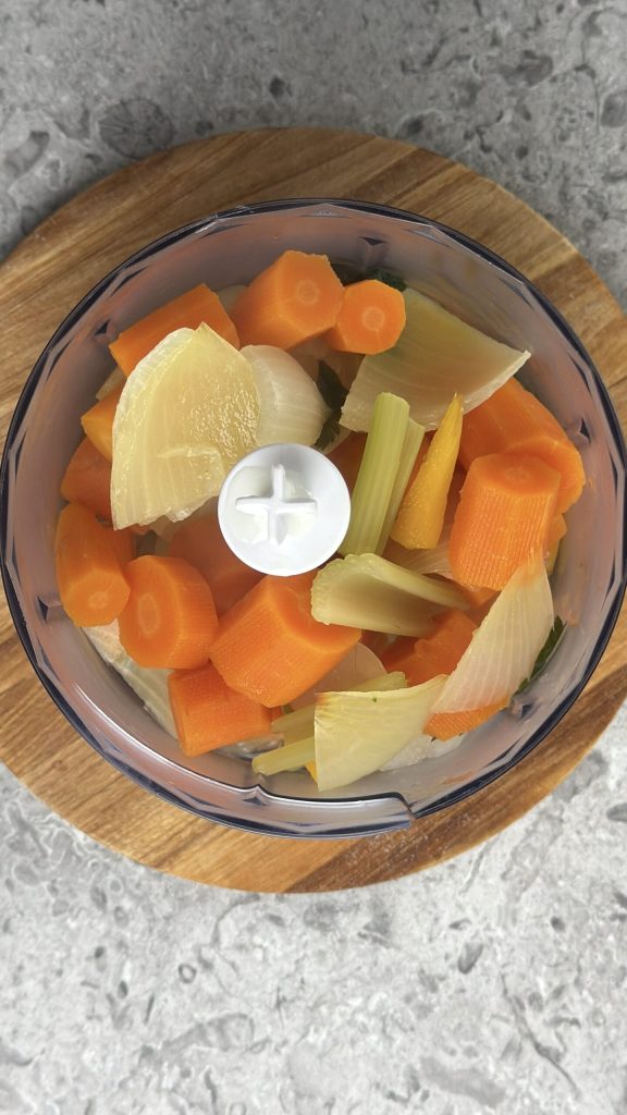 Gib das gegarte Gemüse in einen Mixer und lasse es etwas abkühlen.