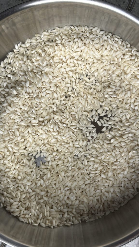 Halte die Brühe warm, sie wird zum Risottokochen verwendet.