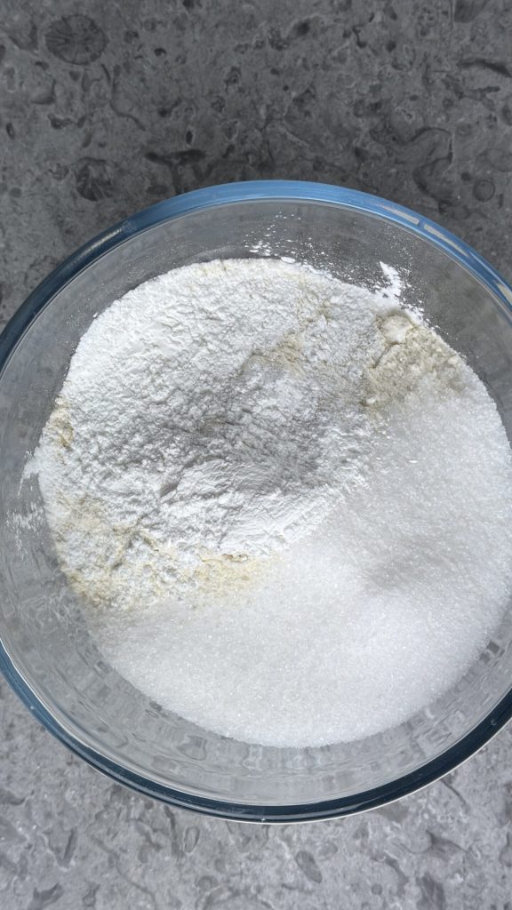 Beginne die Zubereitung der Joghurt-Orange-Muffins, indem du in einer Schüssel Weizenmehl (Tipo 00), Zucker und Backpulver vermischst.