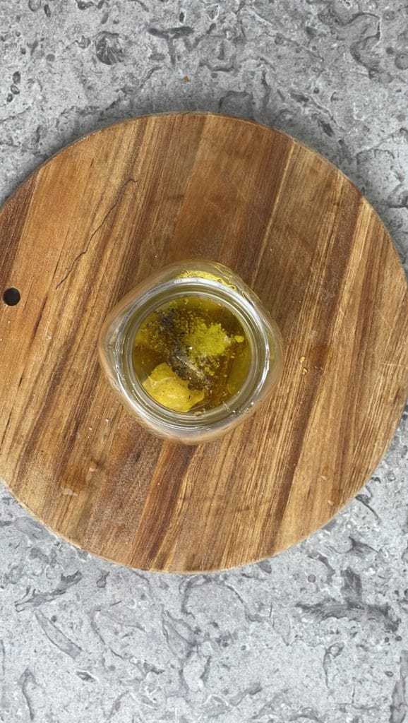 Gib das extra native Olivenöl und den Zitronensaft in ein kleines Einmachglas.