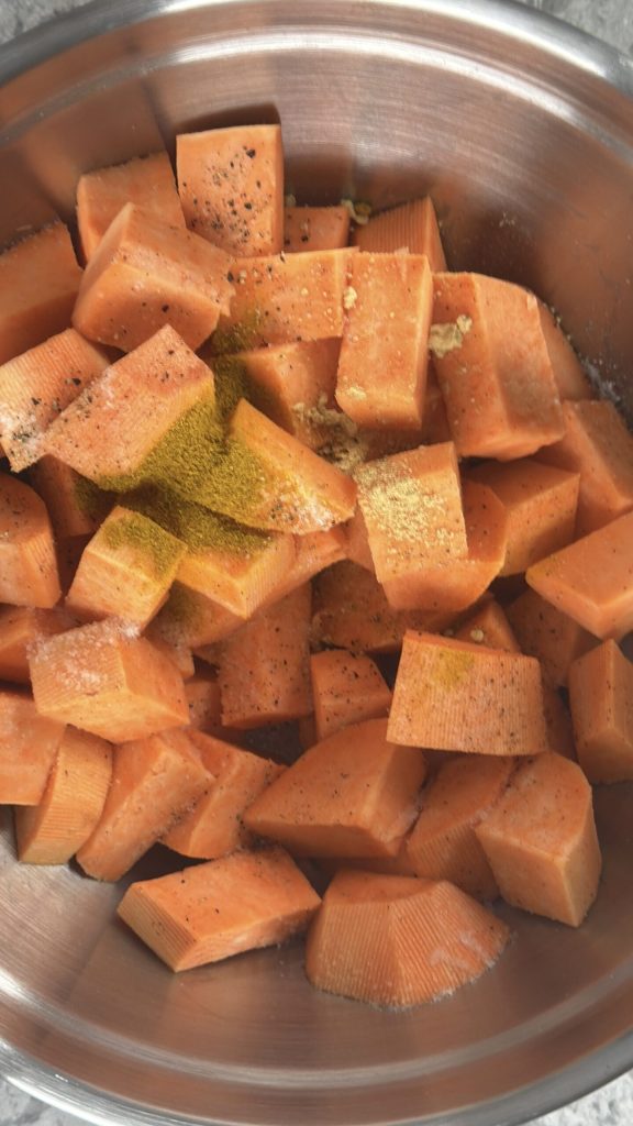 Gib die Süßkartoffeln in eine Schüssel und füge Salz, schwarzen Pfeffer, Ingwerpulver und Curry hinzu.