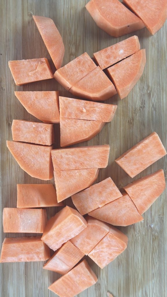 Beginne mit der Vorbereitung: Süßkartoffeln schälen und in etwa gleich große Stücke schneiden, damit sie gleichmäßig garen.