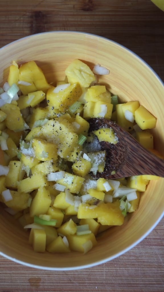 Schäle die Mango, schneide sie in Scheiben und würfle die Scheiben in kleine Stücke.