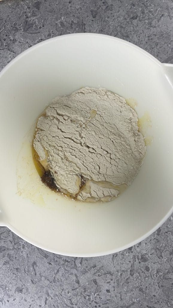 Beginne die Zubereitung des süßen Zimt-Focaccias, indem du die Hefe in der lauwarmen Milch direkt in der Schüssel der Küchenmaschine auflöst.