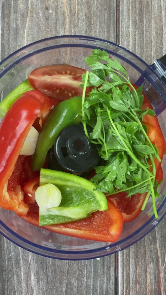Schäle und schneide auch die weiße Zwiebel in Viertel.Gebe die Paprika, Tomaten und Zwiebeln in den Behälter eines Mixers.