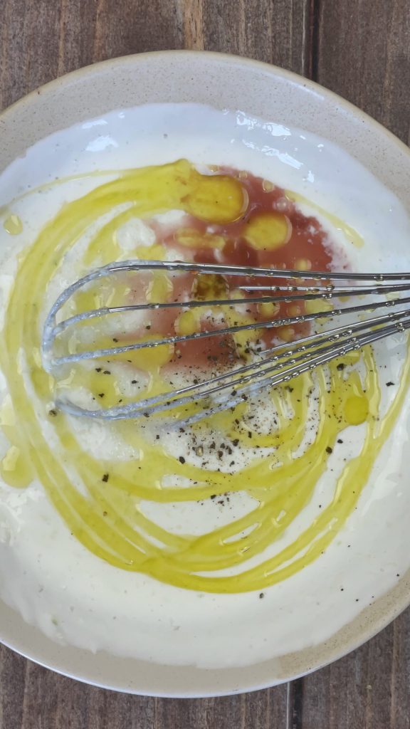 • Würze die Sauce mit Salz, extra natives Olivenöl und Rotweinessig.