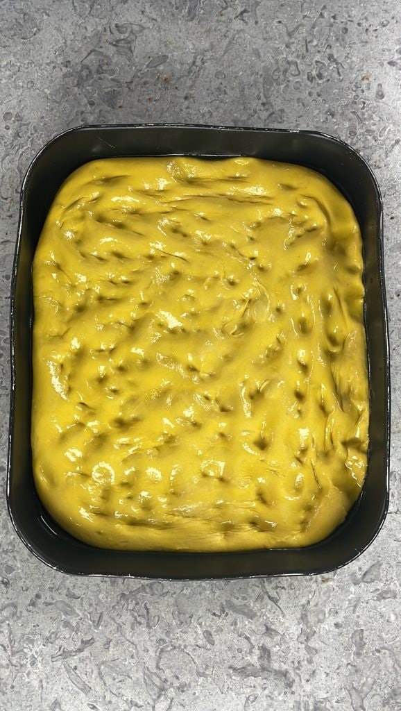 Nimm den aufgegangenen Teig, füge noch einen Schuss extra natives Olivenöl hinzu und breite ihn mit den Händen aus.