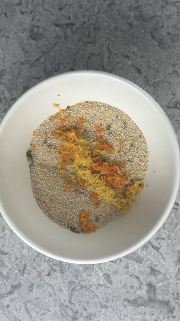 Füge dem Paniermehl Orangenschale, Zitronenschale, Salz, schwarzen Pfeffer und getrockneten Oregano hinzu.