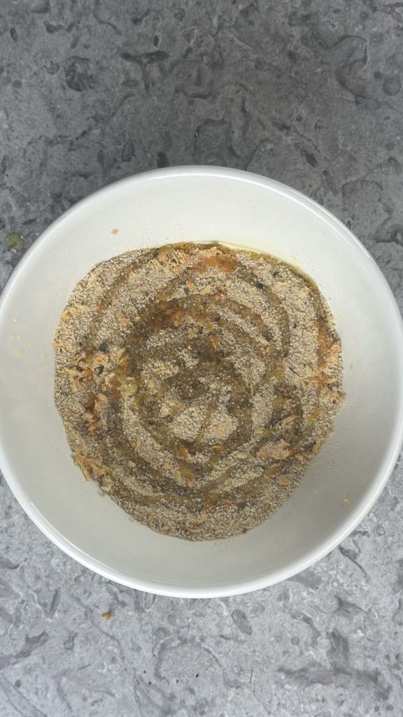Verteile das aromatisierte Paniermehl auf allen Seiten und drücke es gut an, um es perfekt haften zu lassen.