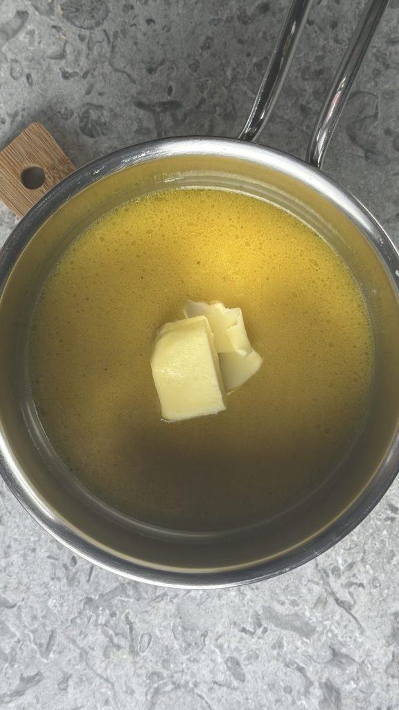 In der Zwischenzeit die Sauce in einem kleinen Topf filtern und ein Stück Butter hinzufügen.