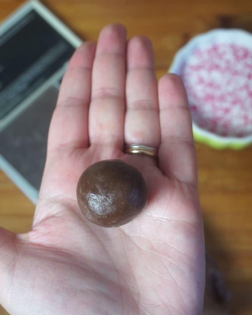 Portioniere ihn, indem du Kugeln von etwa 20g formst.Rolle jede Kugel in bunten Zucker und lege sie auf ein mit Backpapier ausgelegtes Blech.