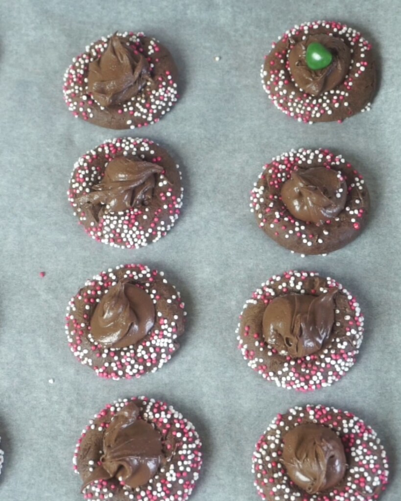 Drücke jede Teigkugel mit den Fingern oder mit der Rückseite eines Teelöffels flach, um eine Vertiefung zu bilden.