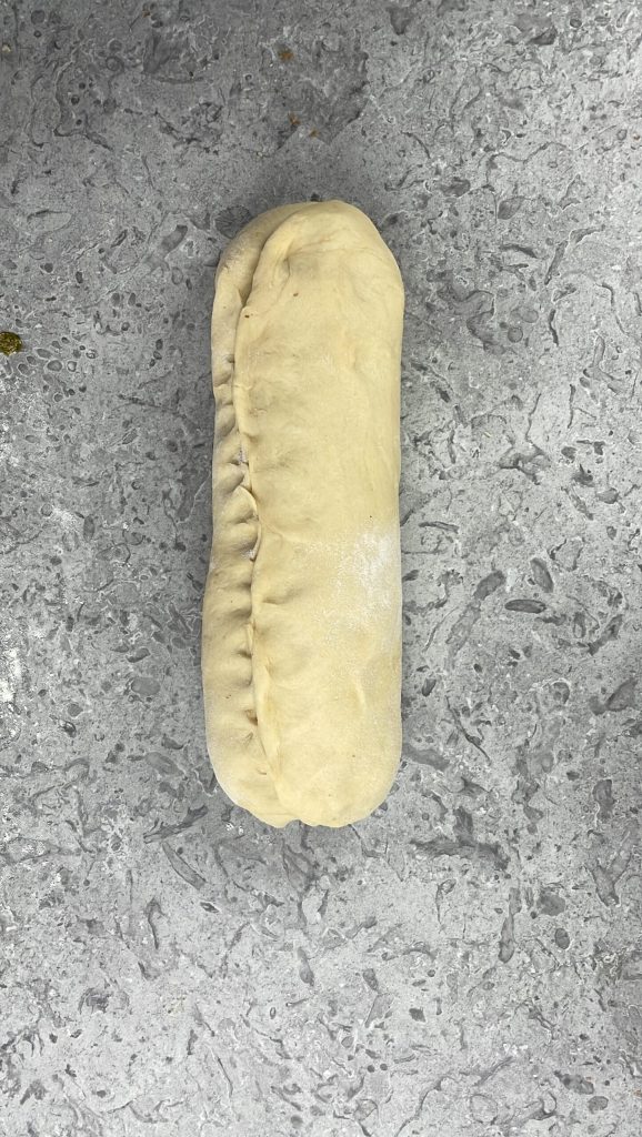 • Rolle den Teig auf der kurzen Seite auf und verschließe die Ränder gut, indem du sie mit den Fingern zusammendrückst.