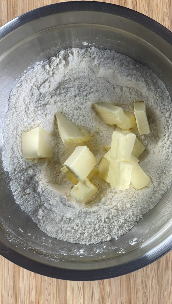 Wiege in derselben Schüssel die kalte Butter in Würfeln ab.Mische gut mit einer Gabel oder den Händen, bis eine krümelige Konsistenz erreicht ist.