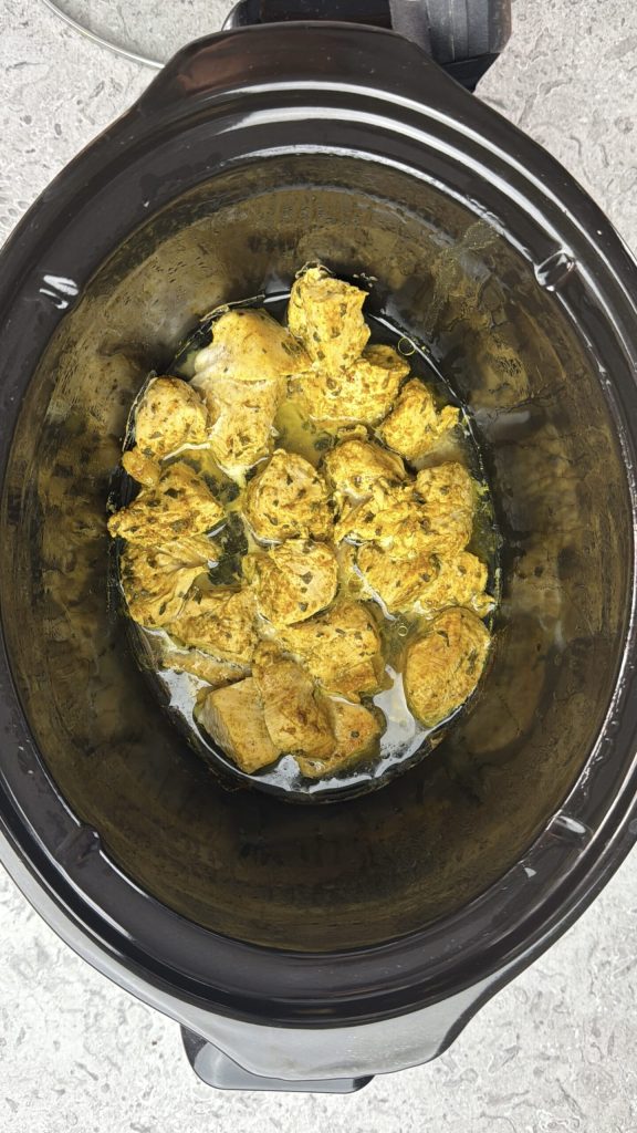 Würziges Hähnchen mit Curry im Slow Cooker, ein einfaches und leichtes Rezept, perfekt, um zarte und aromatische Hähnchenstückchen mit minimalem Aufwand zu erhalten. Ideal für Meal Prep und für alle, die langsames Garen lieben.