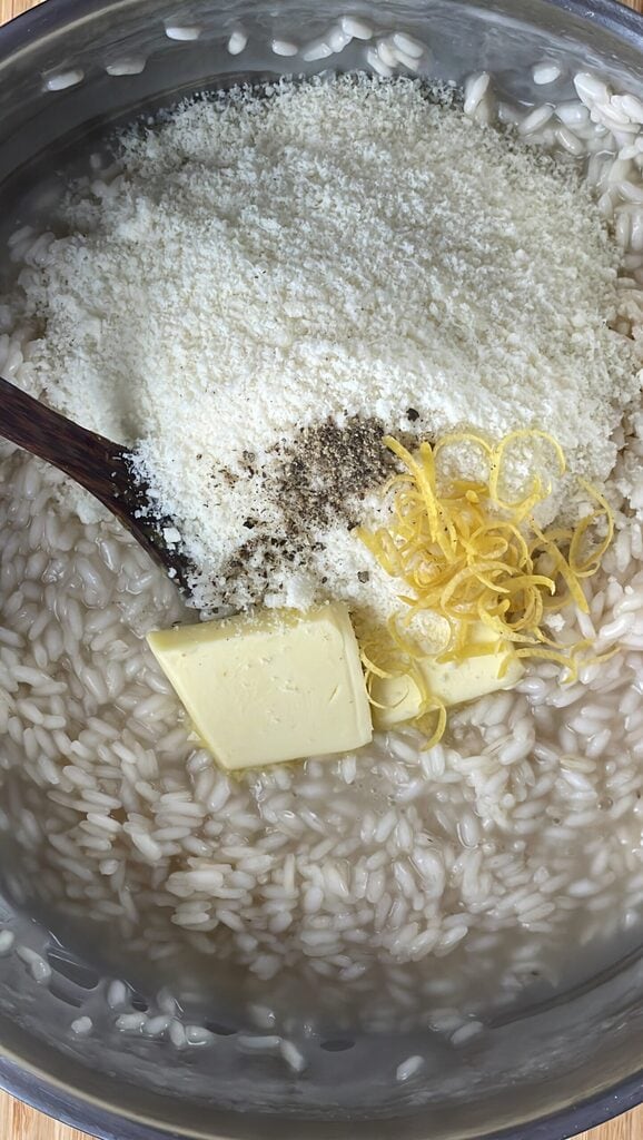 Schalte den Herd aus und rühre das Risotto cremig. Gib die Butter, den geriebenen Pecorino Romano, die Zitronenschale und den schwarzen Pfeffer in den Topf.