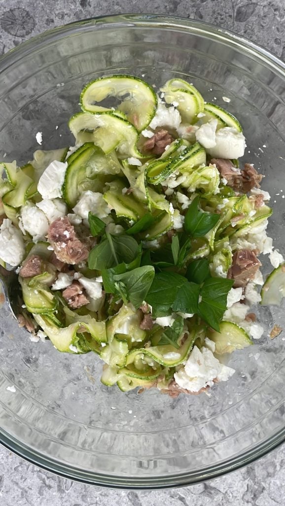 Dieser Salat ist die perfekte Lösung, wenn man keine Lust hat zu kochen, aber dennoch nicht auf eine gesunde und vollständige Mahlzeit verzichten möchte. Dünn geschnittene rohe Zucchini behalten alle ihre Nährstoffe und verleihen dem Gericht Frische, während der Thunfisch hochwertige Proteine liefert und der Feta Charakter und Salzigkeit hinzufügt. Ein Spritzer Olivenöl, Zitronensaft und ein paar Basilikumblätter reichen aus, um die Zutaten bestmöglich zu betonen, ohne sie zu beschweren.