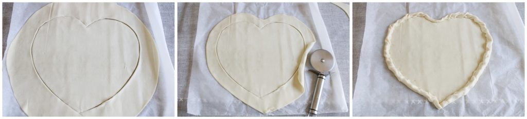 Nehmen Sie den Blätterteig aus dem Kühlschrank und lassen Sie ihn mindestens 5 Minuten bei Raumtemperatur stehen, dann rollen Sie ihn aus. Schneiden Sie mit einem Messer (oder einem Pizzaschneider) die Form eines Herzens aus, dann schneiden Sie außen einen Rand von etwa 3 cm ab und rollen Sie ihn auf, indem Sie ihn mit den Fingern befestigen.