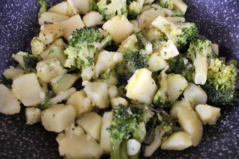 Hier sind die Brokkoli und Kartoffeln in der Pfanne fertig. Guten Appetit!