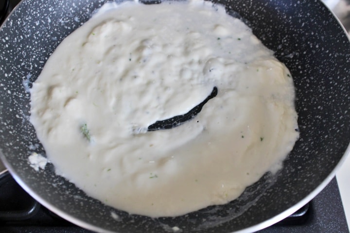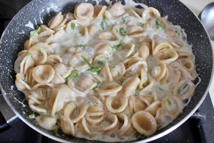 Während die Pasta und die Brokkoli kochen, eine Nuss Butter in einer Pfanne schmelzen, den frischen Käse dazugeben und bei niedriger Hitze schmelzen lassen. Kurz bevor die Pasta abgegossen wird, einen Schöpflöffel des Orecchiette-Kochwassers hinzufügen.