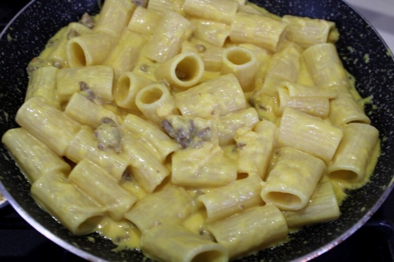• Hier ist die cremige Pasta mit Safran, Wurst und Fontina bereit. Guten Appetit!