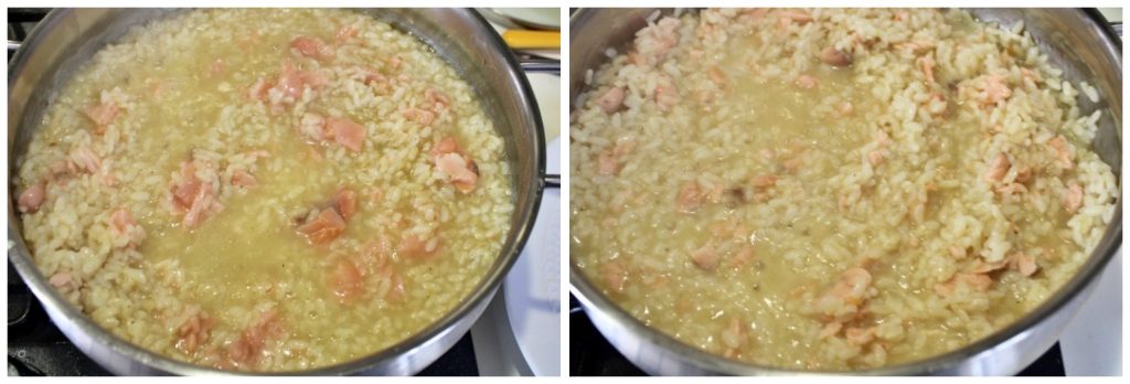 Gegen Ende der Garzeit den geräucherten Lachs in Stücke geschnitten hinzufügen, gut umrühren: wenn nötig, eine Kelle heiße Brühe hinzufügen.