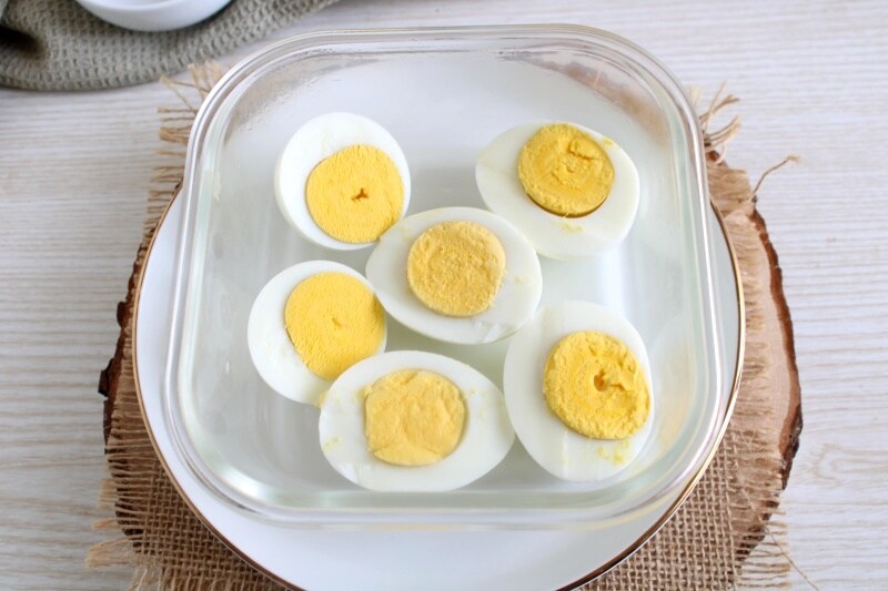 Nach dem Abkühlen die Eier vorsichtig schälen und der Länge nach halbieren. Entfernen Sie die Eigelb vorsichtig und legen Sie sie beiseite.