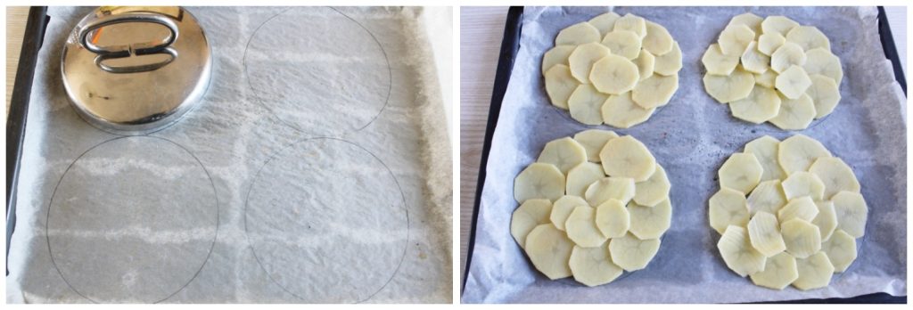Bedecken Sie ein Backblech mit Backpapier, zeichnen Sie 4 Kreise von etwa 15 cm (ich habe einen Deckel verwendet, um genauer zu sein, aber es ist nicht notwendig). Legen Sie die Kartoffelscheiben auf das Blech, überlappen Sie sie leicht, um einen Kreis zu bilden.