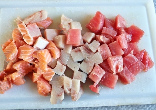 Zuerst den frischen Lachs häuten, in Stücke schneiden und beiseite stellen. Dasselbe mit dem Thunfisch und dem Schwertfisch tun. Achten Sie darauf, dass die Stücke ungefähr gleich groß sind.