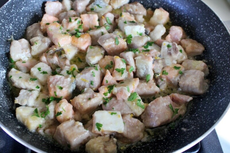 Anbraten, ab und zu wenden und dann den Weißwein hinzufügen und verdampfen lassen. Mit einem Deckel abdecken und die Garzeit beenden. Insgesamt dauert es ca. 10 – 15 Minuten, je nach Größe der Fischwürfel.