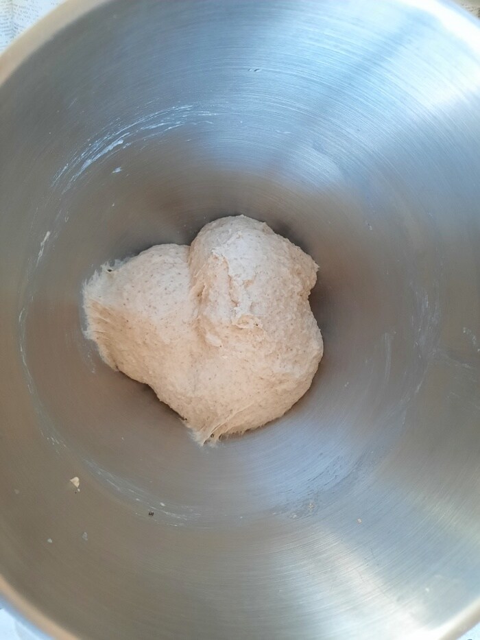 Nach der Ruhezeit fügen Sie die Hälfte des abgekühlten Roggenmehls, die Hefe, das verbleibende Wasser (80 g) hinzu und beginnen mit den Händen zu kneten. Ich habe die Küchenmaschine der Bequemlichkeit halber benutzt.