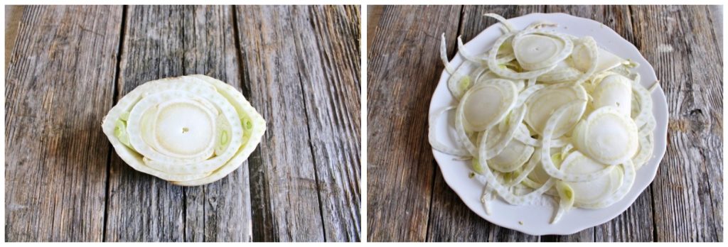 • Zuerst die Fenchel säubern. Entfernen Sie den grünen Teil, die Bart (beiseite legen) und einen Teil der Basis, nicht zu viel, praktisch bündig, um den Blättern das Zusammenhalten zu ermöglichen.