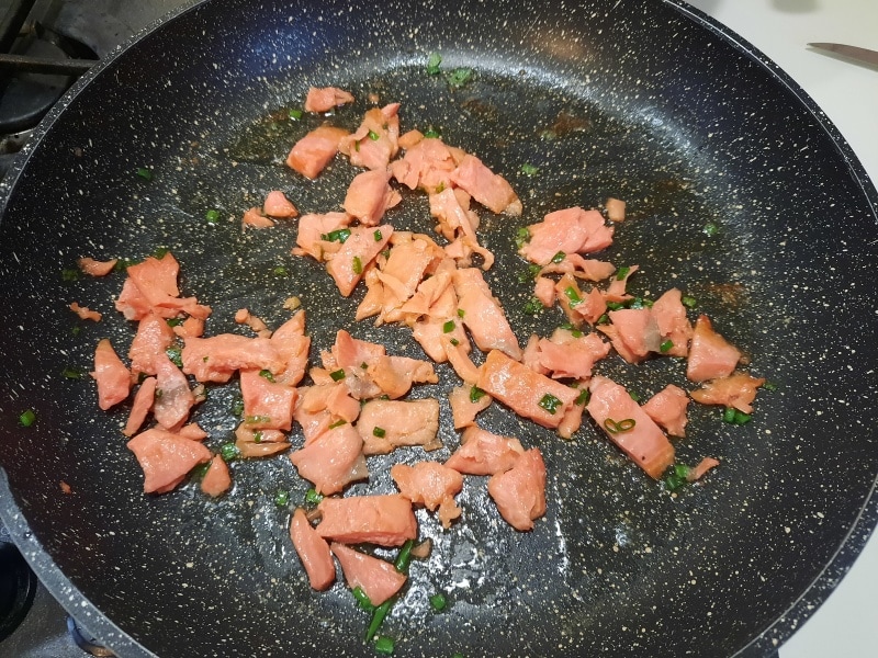– Lachs: Sie können sowohl frischen Lachs als auch geräucherten Lachs verwenden. Wenn Sie den frischen wählen, schneiden Sie ihn in Würfel und braten Sie ihn schnell in einer Pfanne mit etwas Öl an, und wenn Sie möchten, einer Knoblauchzehe oder etwas gehackter Zwiebel.