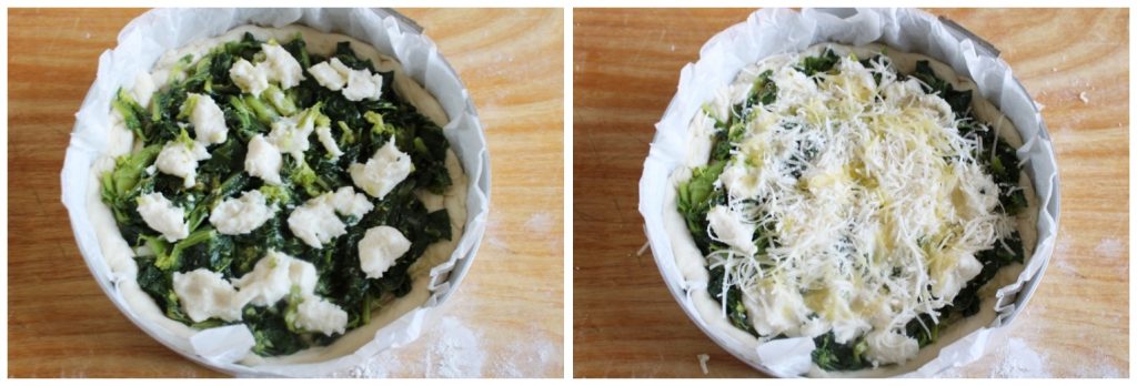 Verteilen Sie den sautierten Stängelkohl gleichmäßig auf dem Boden der Focaccia, lassen Sie einen kleinen Rand frei. Fügen Sie Stracchino in Stücken (oder anderen Käse – ich verwende Reis-Stracchino) über dem Stängelkohl hinzu, dann bestäuben Sie mit geriebenem Parmesan (oder Hefeflocken).