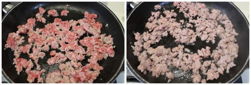 • Entfernen Sie die Haut von der Wurst und zerbröseln Sie sie, indem Sie sie mit einer Gabel zerdrücken und lassen Sie sie mit dem Soffritto für ein paar Minuten anbraten. Wenn sie gut gebräunt ist, fügen Sie den Weißwein hinzu und lassen Sie ihn verdampfen.