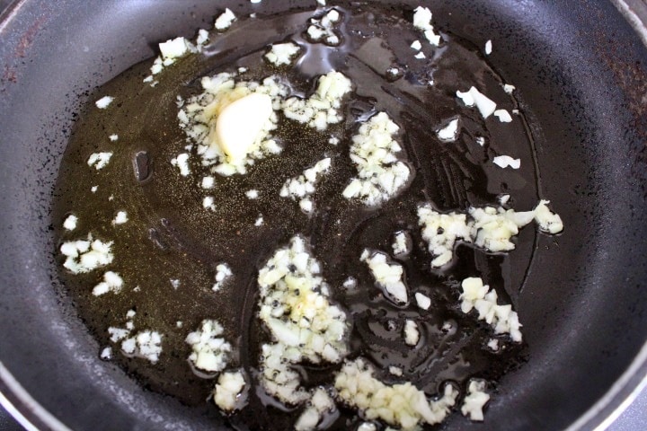 • Zuerst erhitzen Sie in einer Pfanne 4 Esslöffel extra natives Olivenöl, eine Prise Peperoncino (optional) und die fein mit einem manuellen Zerkleinerer gehackte Zwiebel (praktisch und schnell) und lassen Sie sie goldbraun werden.