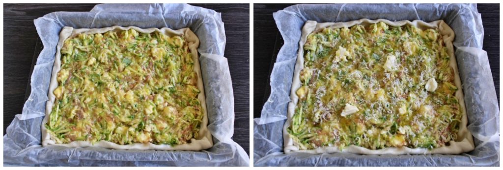 Nun die ausgedrückten Zucchini in eine Schüssel (oder in einen tiefen Teller) geben, die Eier hinzufügen, den geriebenen Käse, den Brie in Würfel geschnitten, den fein geschnittenen Speck, Salz und Pfeffer; alles gut vermischen.
